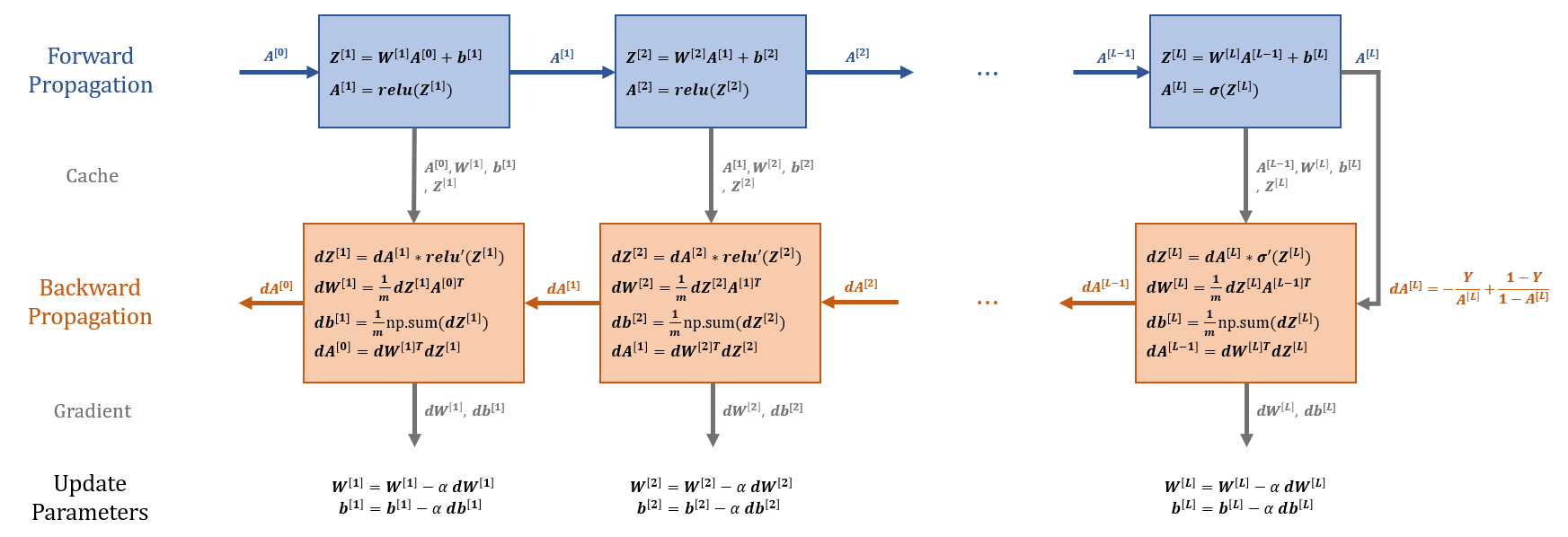L-layer Neural Network에서 최적의 parameter(W, b)와 cost를 구하는 로직은 다음과 같다.